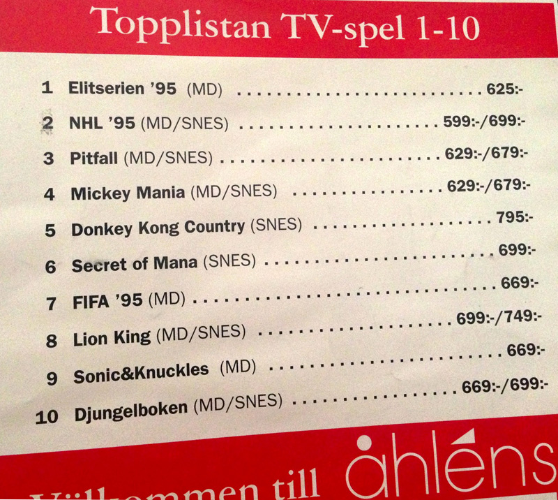 På mitten av 90-talet står fortfarande individuella spelbutiker för en stor del av spelförsäljningen, men största kedjan är Åhléns som har en marknadsandel på över 20 procent. Här syns topplistan under julhandeln 1994 på Åhléns och det är tydligt att hockeyfebern tagit över och Mega Drive är hetast med Elitserien 95 som det bästsäljande spelet, vilket är en viktig markering om marknadsläget.