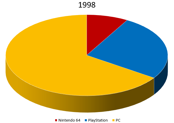 1998 är det PC och PlayStation som dominerar marknaden. På hemmaplan står PC för hela 2,3 av de 3,5 miljoner sålda spelen 1998. Det eldades på av hem-PC-reformen där en anställd kunde köpa en dator mot bruttolöneavdrag skattefritt. Därför är det naturligt att merparten av de spel som skapas för primärt den svenska eller nordiska marknaden är PC-spel. Och de få studios som arbetar med konsol gör det så gott som uteslutande på PlayStation. Framåt slutet av året släpps förvisso Dreamcast i Japan, men det ska dröja innan vi får se ett svenskutvecklat spel till konsolen. DICE var också inne på Nintendo 64 och hade på gång en version av Rally Masters som dock aldrig släpptes och detta skedde senare än 1998.