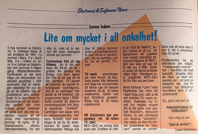 – Heikki fattade att jag var kunnig då jag hela tiden frågade om varför de inte tog in vissa spel till Sverige. På söndagarna satt vi där och käkade pizza och gick igenom nyhetsflödet, vad som händer och vilka spel som fick bra betyg i speltidningar. Eftersom jag läste ACE och CVG så hade jag mer koll, medan de andra inte hade tid och inte heller var lika intresserade av spel som jag var. Det var i ACE som jag läste om Neo Geo första gången och såg att den tillverkas av SNK.