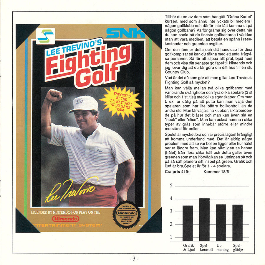 I NES-täta Sverige så var SNK en av de första tredjepartstillverkarna att nå oss. När NES lanserades här i september 1986 så var det med den svarta serien. Smeknamnet kommer från den enhetliga stilen med små svarta kartonger, spelets titel i blått samt en tecknad illustration. Allteftersom så introducerade Nintendo silver- och guldboxar för spel med lösenord och batteriminne. Framåt slutet av 1988 så började spel från andra utgivare dyka upp i Europa. En av anledningarna till avsaknaden av spel från tredjepart var chipsbristen som begränsade antalet spel som kunde tillverkas. Troligen så prioriterades Japan och Nordamerika som var större och mer homogena marknader, medan Europa var indelat i PAL A och B samt att kartongernas produkttexter och övriga marknadsföringsmaterial översattes i flera länder. Spelen från tredjepart kom i kartonger som var några centimeter högre än svarta serien och designen bestämdes av spelutgivarna själva. Först ut i Europa var Konami. Titlar som Top Gun, Gradius, Castlevania och The Goonies II släpptes i silverfärgade kartonger. Tidigt på året 1989 så tågade även Capcom in på NES i Europa och i augusti 1989 så gjorde SNK sin entré med NES-versionen av deras populära arkadskjutare Ikari Warriors. Första året såldes knappt 14500 exemplar i Skandinavien, vilket för den tiden var genomsnittsförsäljningen av ett nytt spel. Totalt över hela sin livstid så sålde Ikari Warriors 25000 exemplar, vilket är bra, men inte extraordinärt. Som en jämförelse så var Super Mario Bros 2 årets hit och sålde 52000 exemplar under 1989, totalt under hela sin livstid landade det spelet på 116000. Året därpå släpptes även Lee Trevino’s Fighting Golf från SNK, en mer modest titel vars försäljning uppgick till 18000 exemplar. Ett av alla dessa exemplar av Fighting Golf kommer att ha en väldigt viktig roll för SNK i Sverige, men vi återkommer till det lite senare. Resten av SNK:s NES-spel nådde aldrig oss i Skandinavien och vi gick miste om pärlor som det Zelda-liknande rollspelet Crystalis.