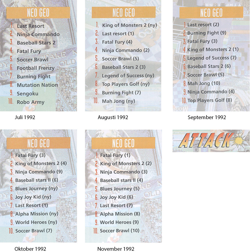Kort efter återlanseringen av Neo Geo skeppades Fatal Fury inför julhandeln 1991. Fatal Fury är ett fightingspel skapat av Takashi Nishiyama som tidigare jobbat på Capcom och utvecklat det första Street Fighter. Det var därför inte oväntat att det fanns mycket likheter. Hypen kring Street Fighter II hade inte riktigt nått Sverige eftersom Super Nintendo-versionen inte släpptes förrän julen 1992. Men för inbitna arkadrävar var Fatal Fury det häftigaste man kunde tänka sig. Med sina stora sprites blev det snabbt ett uppvisningsspel för Neo Geo. Att Fatal Fury var en storsäljare bekräftades av topplistan baserad på försäljning som publicerades i varje nummer av Attack.