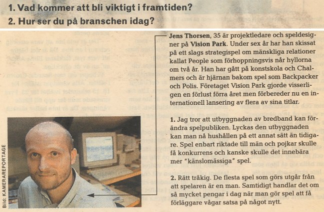 – De [IMG] var knallar från Borås och visst var de duktiga på business, men det blev två väldigt olika kulturer och vi delade inte alls samma DNA. Från att ha varit en kul grej som drevs av viljan att skapa framtidens underhållning på egna egna koncept och unika idéer så blev distributionen tongivande för alla beslut som skulle tas. Det var där pengarna drog iväg och en stab med säljare skulle försörjas. Vision Park blev ett bolag som inte jag kände mig det minsta stolt över att ha varit med och grundat. Istället för att bli Nordens största spelutvecklare så handlade det bara om att sälja, menar Thorsen.