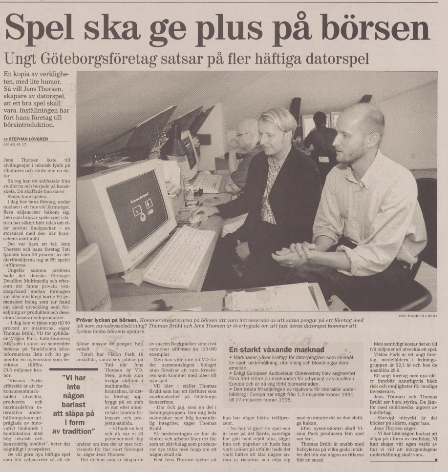 Vision Park tog in riskkapital maj 1997 och börsnoterades på SBI-listan (bytte senare namn till Nordic Growth Market). Antalet anställda ökar snabbt. Mycket av tiden för Jens gick åt att strukturera företag och affärer istället för att skapa spel.