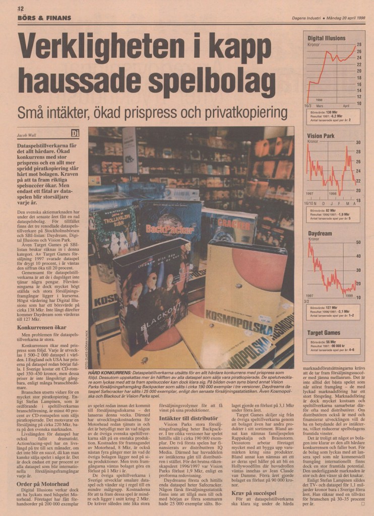 – Vision Park hade bunkrat upp och ställt ut stora volymer i butikskanalen. På distribution ville man göra ett bra resultat och hade en övertro på julhandeln 2000 så man lät butikerna ta in spel och bara betala för det de sålde. Försäljningen blev inte alls så stor som man hoppats utan det kom in enorma mängder returer av osålda från butikerna efter nyårsskiftet. Det var så mycket spel att man lätt kunde fylla ett betongfundament i Öresundsbron. Där kom den stora knäcken för bolaget, vi var inte offer för IT-bubblan, utan det var en självförvållad syn på att folk skulle köpa dåliga spel.