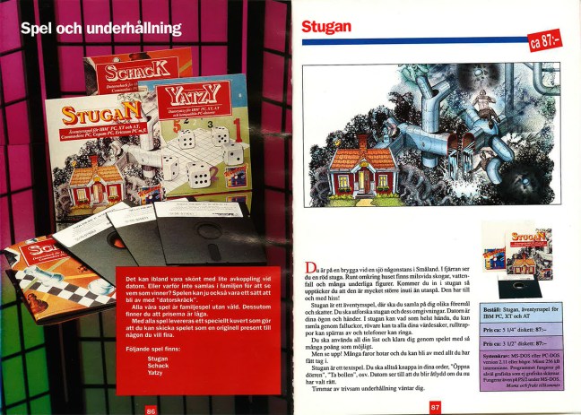 Det första spelet som Scandinavian PC Systems gav ut 1986 var ett svenskt textäventyr vid namn Stugan. Spelet om den mystiska småländska stugan med såväl hiss som grottsystem hade sin början början långt innan dess och var spelbart redan 1978. Bakom spelet står bröderna Viggo Kann (f.d. Eriksson, f. 1964) och Kimmo Eriksson (f. 1967) samt Olle E. Johansson (f. 1963).