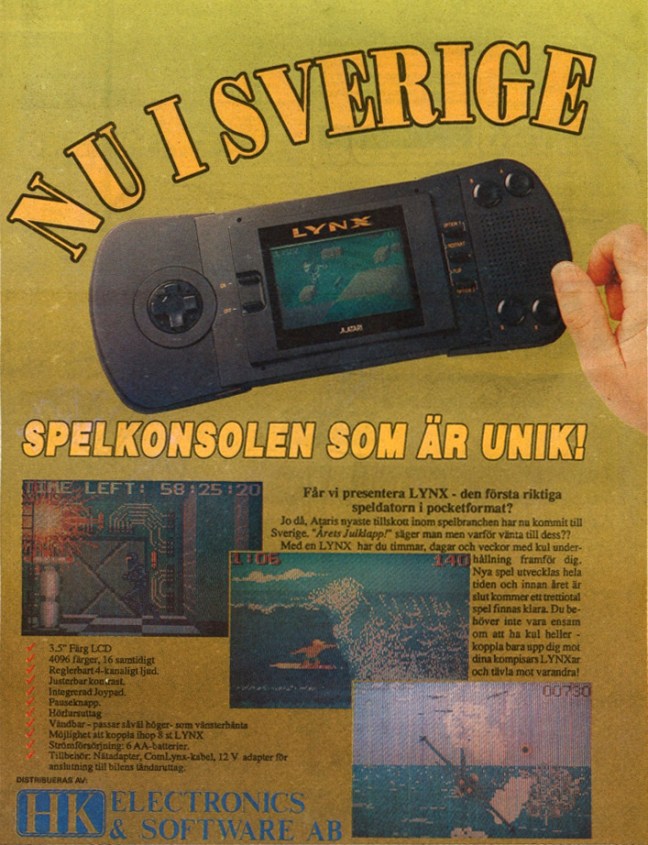 Atari som låg bakom de klassiska konsolerna Pong och Atari 2600 hade under mitten och den senare delen av 80-talet främst satsat på datorer. Men de gjorde comeback inom tv-spel med den portabla konsolen Lynx som med sin färgskärm skulle utmana Game Boy. I Sverige tog Atari hjälp av distributören HK Electronics & Software för att lansera Lynx.